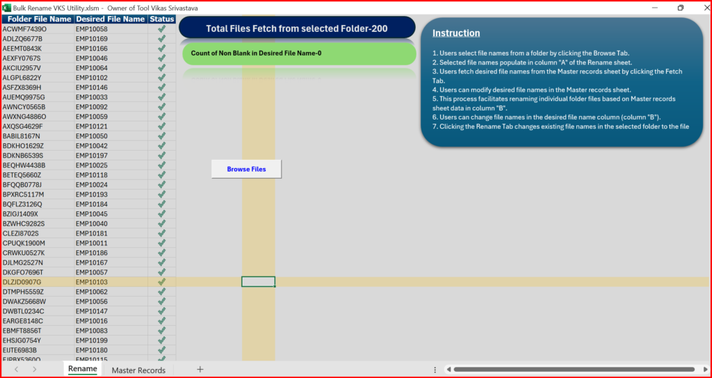 I have developed another application Bulk File Rename Utility in Excel. This Utility allows you to easily rename files based upon extremely flexible criteria.